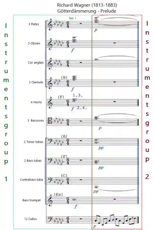 The listing of the participating instruments makes it clear that 2 different instrument groups are responsible for the implementation of the f > p - chords.