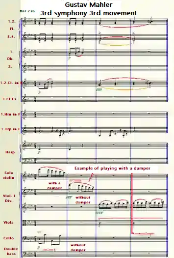 It is possible to give the muted tones a peculiar coloring. To make the character of one voice sound different from that of the others. So that you can clarify it by using the damper. As in a slow movement in which the fundamental bass is made up by instruments playing staccato. And the strings (playing muted) create a veiled sound and thus underline the overall character.