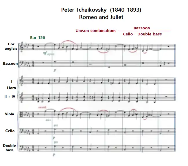Using such combinations in unison means strengthening the string sound. In addition, he gains in abundance. Above all, the combination of the bassoon sound with the deep string instruments and especially the cellos.