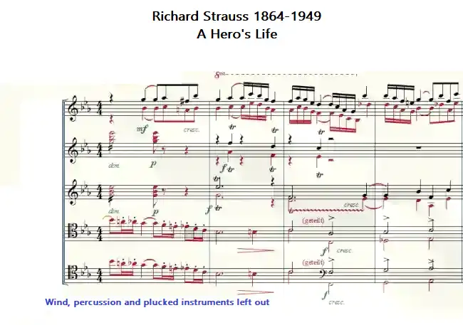 A prime example in "A Hero's Life" by Richard Strauss. In this example score by Richard Strauss, the double division of the cellos and the double basses is shown.