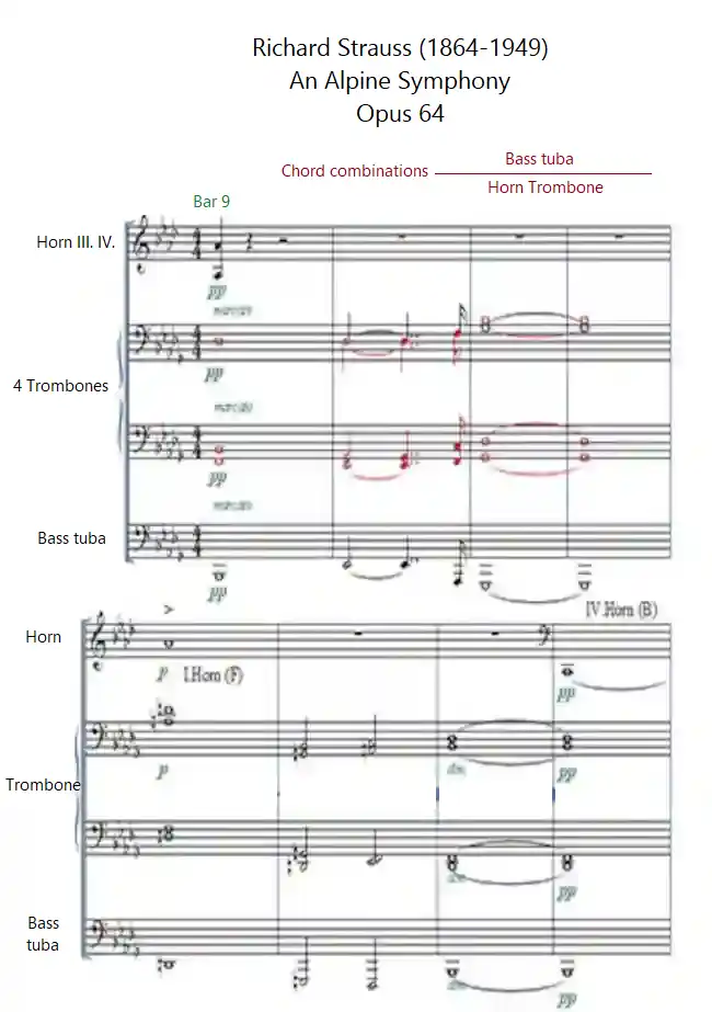 With all sound combinations, the volume possibilities of the instruments should be taken into account. And the required dynamic adjustment is inevitable. Also in the chord combination between the horn and the trumpet or trombone. Only when using the damper is the timbre difference almost eliminated. The dynamic is about the same.