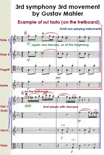 The sound-sharpening overtones are suppressed. The sul tasto is used as a melodic means of expression to color the sound. The sul tasto can also be performed in such a way that when the bow is attacked, its upper octave (including the twelfth ) sounds at the same time as the fingered note, so that the note sounds soft like a flute. This type of execution is also called „flautato“ or „flautando“.