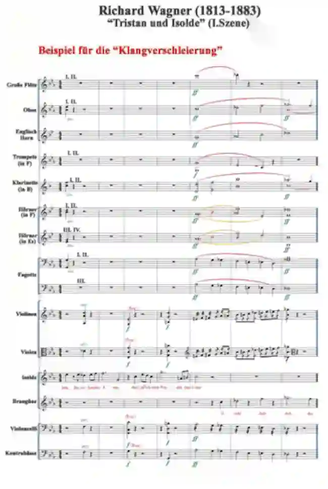 Als Beispiel dafür nehmen wir übergänge, Nebengedanken oder Durchführungsteile zwischen 2 fest abgrenzende Teile mit wenig klarer Harmonik. Paradigmatisch wäre hier eine „verschleiert„ klingende Akkordverbindung. Durch die entsprechende Instrumentierung der betreffenden Akkordverbindung wäre das realisierbar.