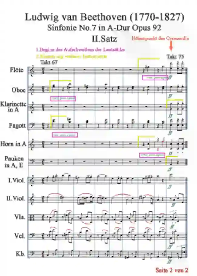 Ab dem Takt 67 treten weitere Instrumente hinzu. Nämlich Holz- und Blechbläser. Auch sie bekommen die Anweisung cresc. poco a poco vorgeschrieben. Alle Instrumente im Orchester erreichen zusammen im Takt 75 den Crescendi-Höhepunkt.