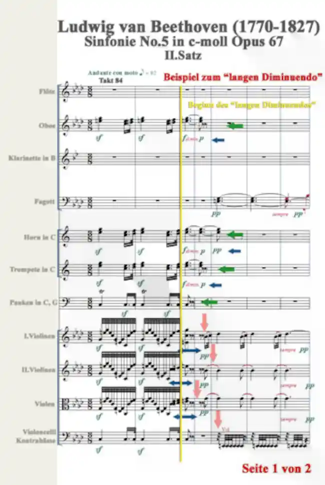 Ein anderer wichtiger Gesichtspunkt in dieser Partitur ist, dass die Celli, die Kontrabässe, die Bratschen und das 2.Fagott wechselt das Register in der Tiefe ab dem Takt 88. Das trägt ebenfalls zum „Diminuendo“ Eindruck bei.