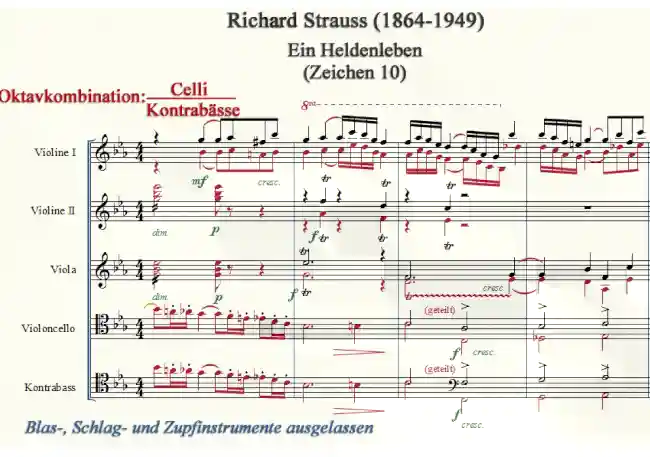 Ein vorbildliches Beispiel in "Ein Heldenleben" von Richard Strauss. In diesem Partiturbeispiel von Richard Strauss wird die zweifache Teilung der Celli und der Kontrabässe dargestellt.
