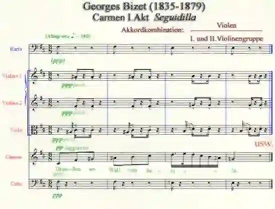 Die Viola (oder auch Bratsche genannt) kann wie eine dritte Violine, verwendet werden. In völliger Verschmelzung mit den 1. und 2. Violinen . Folgendes Partiturbeispiel macht es deutlich.