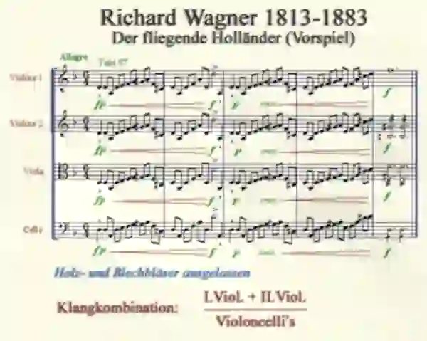 Es folgen 2 Grafiken mit einem Partiturauschnitt. Ausschnitt aus der Partitur „Der fliegende Holländer“. Komposition von Richard Wagner. Ein Beispiel zu den [ Oktav-Kombinationen ] der Violine mit dem Streichorchester. Die Grafiken können zudem vergrößert werden. Sie sind Verweis-Sensitiv [Anklickbar].