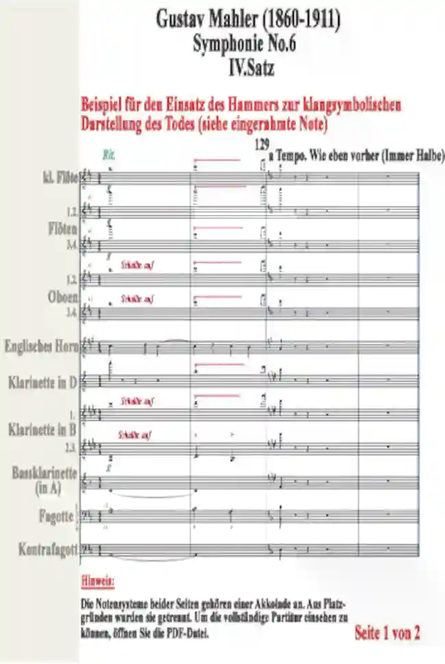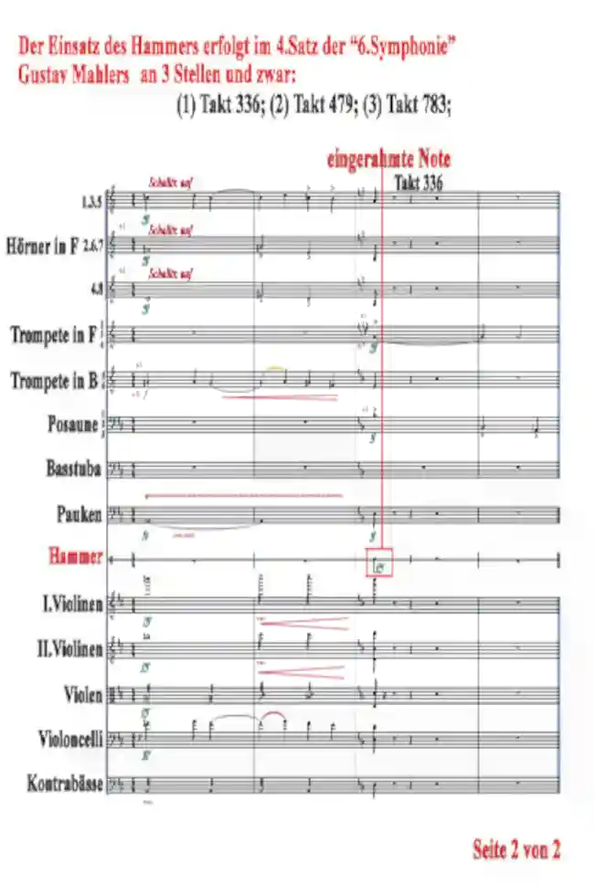 Im folgenden Beispiel wird ein Partiturausschnitt von Gustav Mahlers „6. Symphonie“ verarbeiten. Prompt entsteht die Vermutung, dass der Hammer als Klangsymbol des Todes auftritt. Denn die unterschiedlichen Stufen der Dynamik, die Hammerschläge und die zentrale Idee unterstreichen, dass. In diesem Beispiel werden wir den Hammerschlag vom Takt 336 bearbeiten.