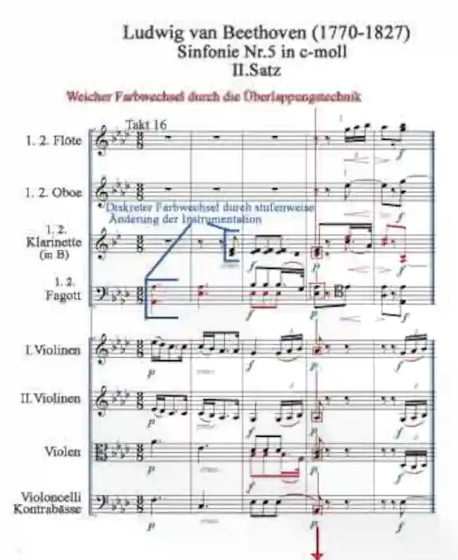 Das folgende Partiturbeispiel beginnt im Takt 16 mit dem dominierenden Klang des Streichorchesters. Die Kontrastbildung ist dabei gering. Eben weil von den Holzbläsern nur das Fagott in den Takten 16 und 17 erklingt. Der dabei erzielte Farbkontrast ist gering. Aufgrund der geringen Fähigkeit zu verschmelzen, mit den Streichern. Erst am Ende des 17. Taktes erklingt die Klarinette.