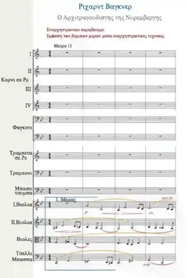 Ας δούμε τώρα όμως το παράδειγμα. Είναι απόσπασμα τής όπερας „Ό Αρχιτραγουδιστής τής Νυρεμβέργης“ τού Ρίχαρντ Βάγκνερ . Βλέπουμε το πρελούδιο τής πράξης Γ΄ (μέτρα 11-18). Σαφής είναι ή διάταξη των δομικών μερών. Αυτό συμβαίνει μέσω ενορχηστρωτικών τεχνικών. Πραγματοποιείται με την παράθεση των οργάνων των διάφορων ομάδων. Λοιπόν, ακούμε την απότομη αλλαγή τους. Δηλαδή, την μετάβαση από τα έγχορδα (1.μέρος) στα πνευστά (2.μέρος). Και αυτή ή αλλαγή συμβάλλει στην αποσαφήνιση τής δομής.
