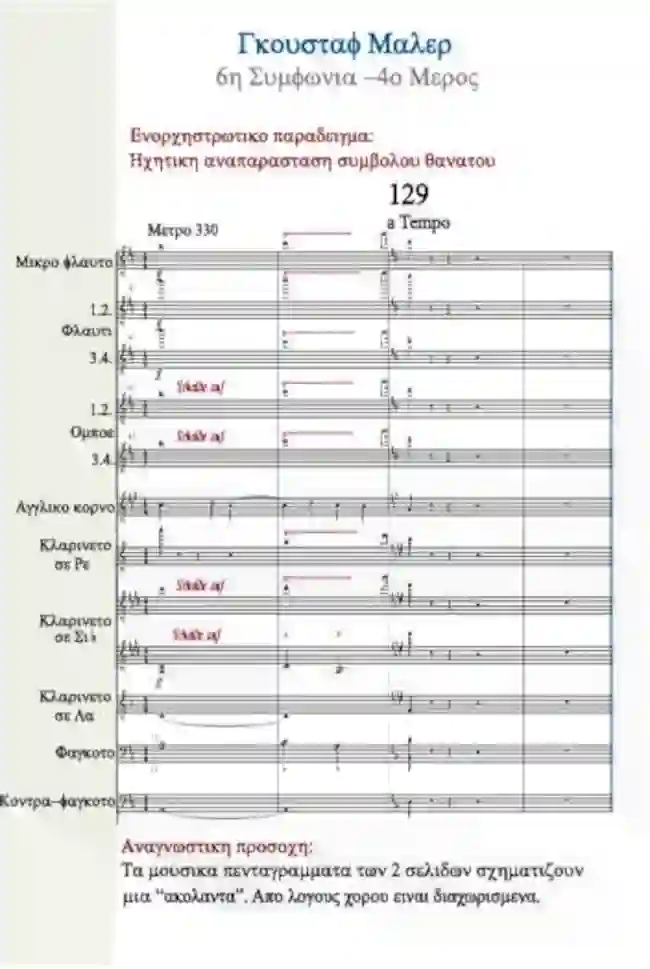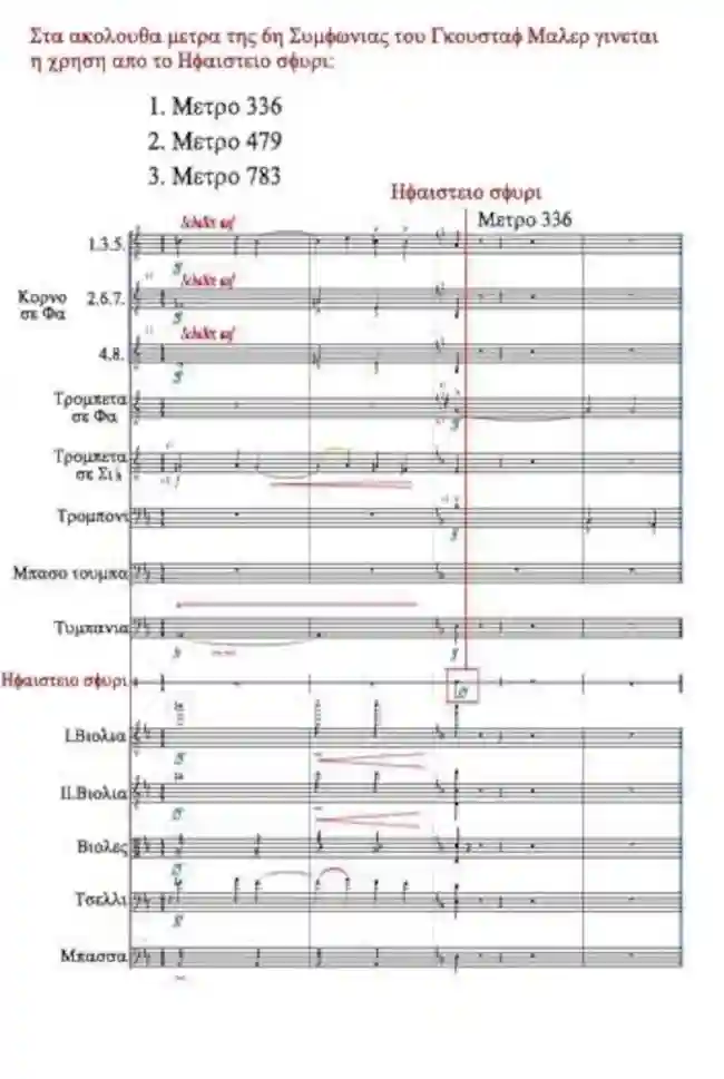 Στο ακόλουθο παράδειγμα βλέπουμε τη χρήση τού σφυριού. Είναι απόσπασμα από τη 6η συμφωνία τού Γκουστάβ Μάλερ. Χρησιμοποιεί το σφυρί πάντα με διαφορετική δυναμική των κτυπημάτων. Μάλιστα και στις 3 περιπτώσεις στις οποίες χρησιμοποιείται το σφυρί. Στο μέτρο 336, στο μέτρο 479, και στο μέτρο 783. Σε συνδυασμό με τη βασική ιδέα της σύνθεσης πρέπει να υποθέσουμε ότι το σφυρί ενεργεί ως σύμβολο τού θανάτου. Στην παρτιτούρα απασχολείται το κτύπημα τού μέτρου 336.