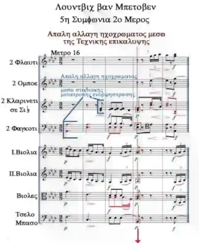 Στο ακόλουθο παράδειγμα κυριαρχεί ό ήχος των έγχορδων (μέτρο 16). Ή παραγωγή χρωματικής αντίθεσης είναι εδώ χαμηλή. Διότι στα μέτρα 16-17 ηχεί από τα ξύλινα πνευστά μόνο το Φαγκότο. Ή ικανότητα συγχώνευσης τού Φαγκότου με τα έγχορδα είναι ιδιαίτερη. Λόγω αυτού ή χρωματική αντίθεση πού παράγεται δεν είναι έντονη.