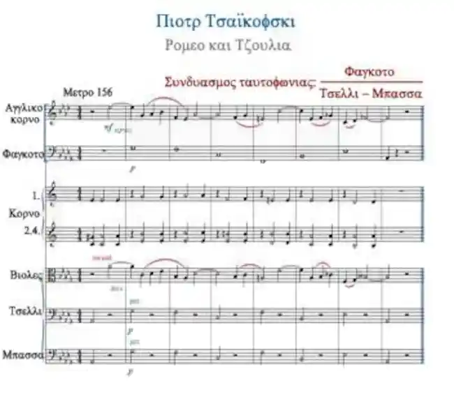 Εξαιρετικό παράδειγμα συνδυασμού ταυτοφωνίας: Φαγκότο/έγχορδα . Τα Βιολοντσέλα με τα Κοντραμπάσα κρατάνε το θεμελιώδη μπάσο. Παράλληλα παίζει το Φαγκότο στο λεγκάτο. Ενώ, τα έγχορδα παίζουν πιτσικάτο. Ή ηχητική επίδραση πού παράγεται είναι ηχηρή. Μελετήστε την παρτιτούρα: