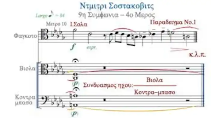 Ό Ντίμτρι Σοστακόβιτς, χρησιμοποιεί εδώ το σκληρό ήχο μίας τέτοιας συγχορδίας στο piano. Ως βάση, για ένα σόλο τού Φαγκότου. Και ή ηχητική επίδραση είναι μεγάλη. Ακολουθεί το παράδειγμα [ 9.Συμφωνία 4.Μέρος ].